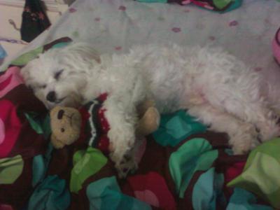 My Bichon Maltese Bentley will be one on August 4th. he is the BEST dog that I could ask for! He sleeps on my bed at night and watches me the whole night. It isn't until around 3:00 in the morning he passes out because he is to tired :)