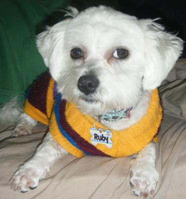 My Bichon Maltese Ruby is a joy! She was born on 20 July 2008 and came into my life at 6 weeks old, and is now 14 months. She is extremely playful, friendly and loving. A great companion who loves sitting on your lap and getting cuddles.