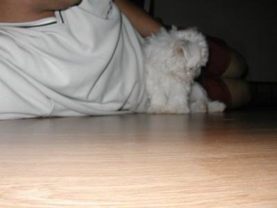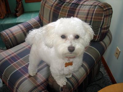 I have two Bichon Maltese dogs. Beau is a male Malti-chon (half and half) that was featured earlier. He is so smart and loves dog commercials on TV! He was easy to house train and gives us lots of love and lots of laughs. Since both of us work, I knew he had a lonely time during the day. So, for his 3rd birthday, I brought home a companion. Her name is Lizzie. She was 6 weeks old when we got her. She is also a malti-chon (more Maltese than Bichon, her mom is a Malti-chon and dad a full blood Maltese) Her hair is much finer and silky feeling. Everything thing Beau was when he was little, Lizzie is not!!! She is not doing well with potty training and she is a very loud barker. But she is so cute and loves to give kisses and she LOVES her brother Beau. She constantly teases him to get him to chase her..then, the race is on! At night they both cuddle up with mom and dad and go to sleep.This picture was taken right after coming home from grooming. Lizzie had to have a close shave because she won't hold still for brushing. You can tell by the look on her face she is about to pounce on Beau for a little game of tag!