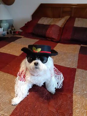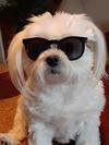Heidi is just chillin' in her scarf, hat, and shades! Looks like she is trying to look like Stevie Ray Vaughn! Heidi is a Malti-pom. She is 4 years old. She looks Maltese but has a Pom personality! Her idol seems to be Cujo!