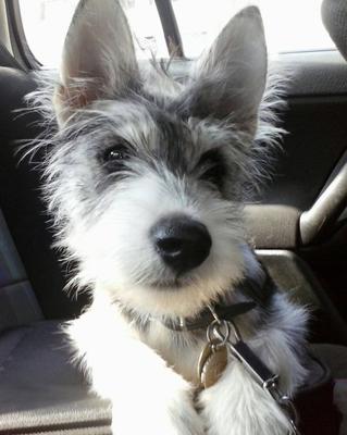 Mia is all black with some white markings on her paws, nose, chest, and tail. She looks mostly like a very "large" Maltese, weighing in at 25 lbs. She does not shed, and house-breaking her has been an ordeal. Her personality is most like a standard Maltese, though she seems to have a bit more energy than any Maltese I've ever encountered.