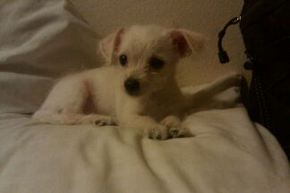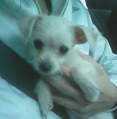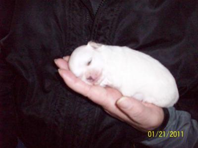 The mother is a long haired Chihuahua named Chloe, and the father is a Maltese named Bently. There were four puppies in the litter. One black male that they were planning to keep and had named Elvis (the obvious alpha of the litter), a brown male (my mother and I called Brutus), and two white females, one was the only Chihuahua looking one of the litter and the other was our little Lace (the runt).