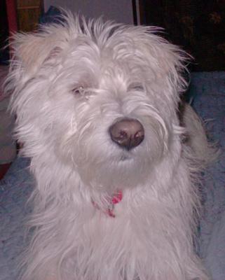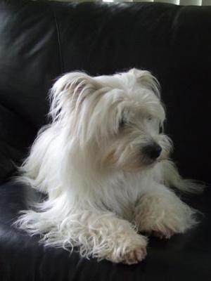 We adopted our Maltese and Westie mix dog Sassy last year when she was about 10 months old. She came to us with absolutely no training. She was 10lbs when we got her, but now she's about 13lbs. Her name was originally "Precious". While we think that she can be precious she is definitely a Sassy little girl who Loves to bark and steal things and eats paper. Our Maltese Westie mix has come to love us very much and we just adore her. I wish she would bark less but that is part of what makes her personality. She is extremely intelligent and loves to cuddle and oh does she love to have her belly rubbed.