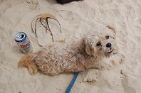 Kaycee is a male Poodle Maltese mix who will be three years old in July/12. He is quite the character. White for 5 mins after his grooming before he gets all dirty. Loves to go camping, swimming, can dance. Loves people. When he tells you off or does not want to do something he sits down on his rear and throws his front paws at you or will do a version of his mean growl. Very protective/jealous of me his owner. Speaks to you when you talk to him. Kaycee is the boss of my roommates dog Billy a Jack Russell. My Poodle Maltese mix shows him constantly who is boss of the house.