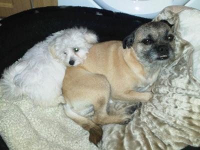 Hi everybody I would like to introduce myself. I am a Maltichon and my name is Finnigan or Finn for short (and sometimes I even get called "you little monkey" I am 11 months old and spoiled rotten. I have a 14 year old sister who is a yellow lab and I love her to bits, sometimes but not very often I think she gets fed up of me teasing her and she will show me how big and white her teeth are and boy when I see those pearly whites I know its time to hide ha ha ha.