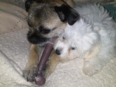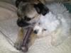 Chewie is my little Maltichon! He's a dark white, 3 months old and is very sweet :X. I also have a Caniche. She is white, have 4 years and 4 months and her name is Cindy. Chewie is always with her and he wants to play with her and she refuses him because she is an adult and doesn't have a playing obsession like him:))...