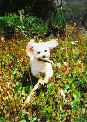 Sugar found me while I was searching my local animal shelters for a Shi Tzu pup. She is an adorable albino Maltipoo. I immediately paid the adoption/ medical fee, then had to wait a day for her surgery and micro-chipping.She was approximately 9 months old at adoption, and absolutely wonderful. She always wants to be near me, loves to play, sits on the back of my chair/ couch behind my head. She is very smart, has learned sit, wait, lay down, roll over, dance, sit up, and enjoys walks off her leash. She loves to play fetch, keep away, and tug o war. She also works! The original Maltese were bred for pest control, and my Sugar has killed several mice and rats that have invaded our neighborhood during this drought. I limit her sun exposure to prevent sun burn and she doesn't need any other concessions for being an albino.