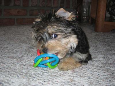 I received a Morkie puppy for Valentines Day of 08. He was this adorable blonde/brown/black color and so full of energy. He knew we were his parents right when he saw us. I have to say it took about 6 months to potty train him but it was well worth the wait. As he grew his hair changed to almost completely blonde with black ears and it is adorable!!