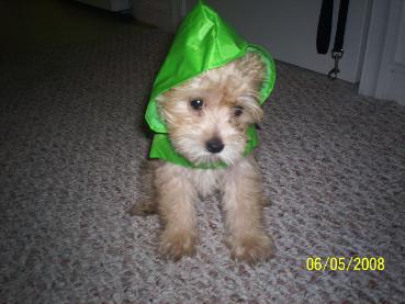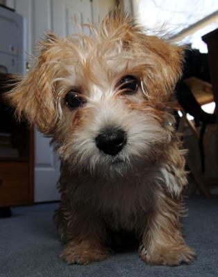 She's about 6 months old now and weighs a bit over 10 lb. perhaps big for the breed. As I've read, she seems to be more of a Yorkie than a Maltese. On the downside, she's the most destructive dog I've owned, she has managed to ruin several rugs now, chewed a little bit on the woodwork and loves to chew off my shoe laces. She has proven to be very hard to housebreak (even worse than Sam and Tibetans are known to be difficult) but that's mostly our fault since we never really crate trained her. She has a very, very loud piercing "squeak" which she uses when she wants attention, etc. that can be incredibly annoying.