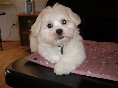 We bought her from a breeder who only had 2 litters of Peke-a-tese. We had to be on a waiting list for 6+ months and then had to drive 4 hours to get her. Her mother was a fawn & black purebred Pekingese and her father was a purebred Maltese. Pika is completely white with light cream spots here & there. Her litter mates were all white & cream as well. She is currently 4.5 years old and weighs just under 10 lbs. Her hair/fur is an even mix of Peke & Maltese... silky & straight on her head, ears, tail & underside & chest, and wavy with some wiry hairs along her back & sides. We keep her in a shaggy 'do and brush and comb her often. Her face can best be described as an even mix of Peke & Maltese as well. Her nose is not too long, not too short... although she does grunt & snore a little. She has big beautiful brown eyes. She does have a slight underbite and one crooked tooth, but it just adds to her character. You only see her teeth about 50% of the time, and even then only 3 show. She does have runny eyes at times, but we keep the tear stain areas trimmed. We did have extra eyelashes removed by our vet as well. Aside from tooth & eye problems she is a very healthy dog. She doesn't get an upset stomach if she eats something she's not supposed to, and LOVES to ride in the car (without getting sick). She is all muscle and very sturdy! She is longer than she is tall, but not by much. Her back is "flat" like a Peke's, and she has the feathery Peke feet. She does not waddle like a Pekingese at all, though and is quite fast.