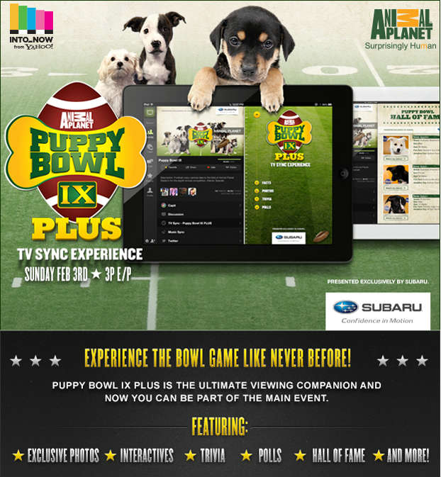 This year Subaru is featuring the Puppy Bowl on a cool new app. You can download it for your tablet or mobile device now and the interactive content will be available during the Puppy Bowl airing on Sunday 2/3/13 at 3pm e/p on Animal Planet. Go ahead and download it in iTunes as "IntoNow."