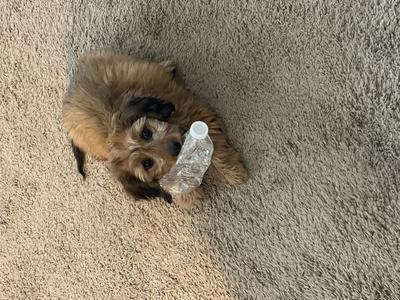 She loves playing with her litter mates who all went to other members of our family. She is like a goat in that she explores her surroundings and the whole world with her mouth! We have finally convinced her to only chew on her toys and not our shoes!!