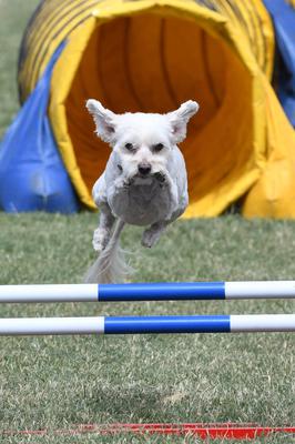 10 years old and still running agility courses like she was a puppy. Just look at her determination. Love my Crested Malt! Best friend and great cuddles.