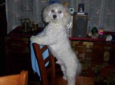 She is a 3 year old magnificent "baby". (that is what everybody thinks: she is a baby). The fact is that our Silky Cocker Hally is the most lovely dog ever. She is less than 10 pouts now, with white silky hair, little beige in her ears.