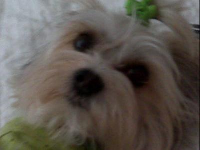 Dinni is about three years old, his mama was a Maltese and his daddy a Yorkie. He weighs about 7.8lbs, barks at anything he sees and really believes he is a big dog.