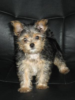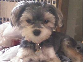 My Maltese Yorkie mix dog is sweet and loving - a follower not a leader. Violet is like a live stuffed animal; the kind you can bend into any angle and is comparable to a ferret. At 8 months old she is extremely light weighing 5.5 pounds and stands 7 inches tall. She is whitish-cream colored with black ears and a black feathery tail and resembles a "Benji" dog. Violet has beautiful large round black eyes. Her hair is super soft and she always comes when you call her. I discovered her at our local shelter and paid $60 dollars for her. What a steal! Another thing about Violet is that she is not the brightest dog on the block. She acts like a dumb blond. We have had her for 3 months and she is still not housebroken. We have a hidden fence and our Morkie continues to cross the line and gets shocks all the time. She still hasn't figured it out even with 2 weeks of leash training. She gets along well with our other dogs. Everybody that sees her wants her. We are lucky to have her.